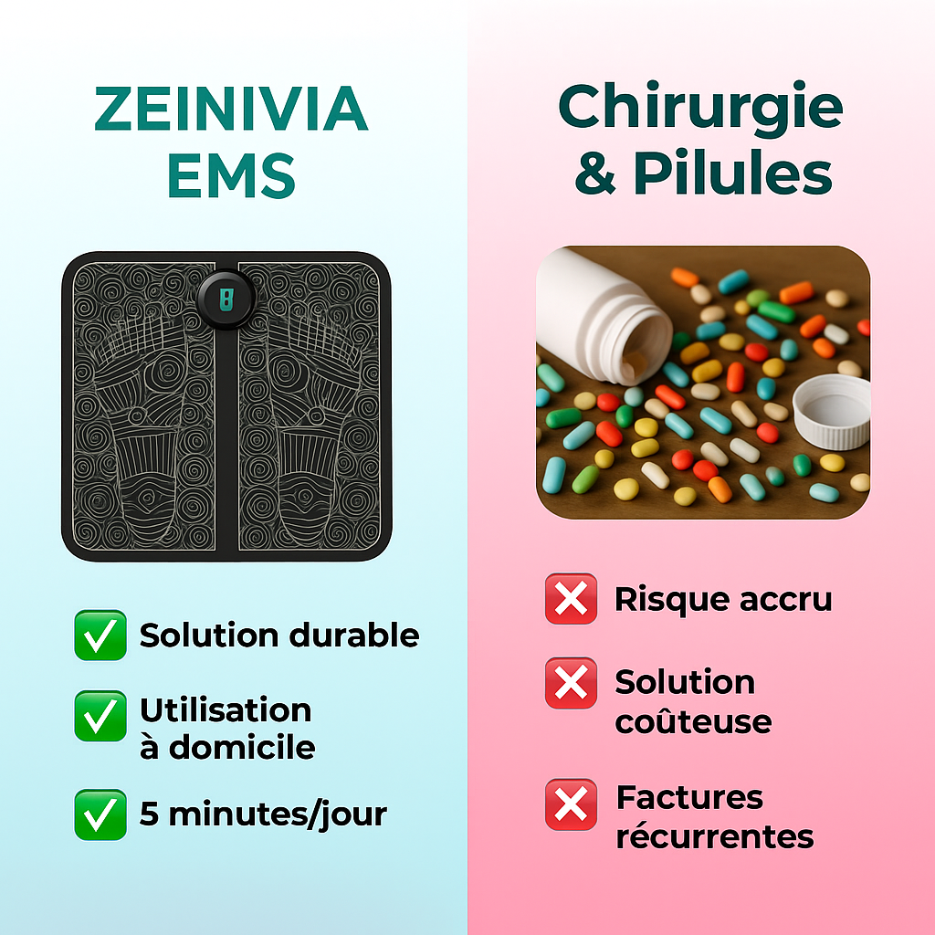 Zeinivia™ propose une approche différente : une stimulation EMS régulière qui réactive en douceur les nerfs et les muscles responsables du mouvement du pied. Résultat : une récupération progressive, naturelle et durable, sans recours à des traitements invasifs.